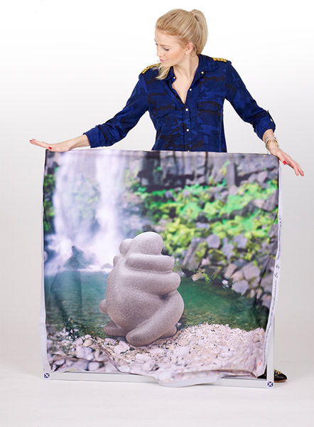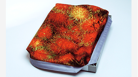 Die Textilgrafik wird umlaufend mit einer vernähten Gummilippe versehen. Diese wird in die Nut des Rahmenprofils gesteckt und die Grafik damit straff im Rahmen verspannt.