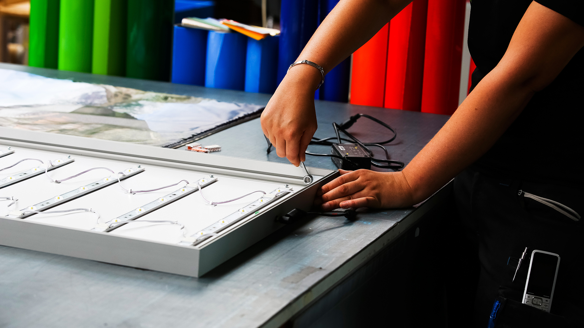 Die Kästen können je nach Wunsch für den Außen- oder Inneneinsatz konzipiert werden. Dabei kommen Spanntücher oder Acrylglas-Scheiben für den Druck zum Einsatz. Durch spezielle Schienenverbinder können auch sehr große Formate hergestellt werden.